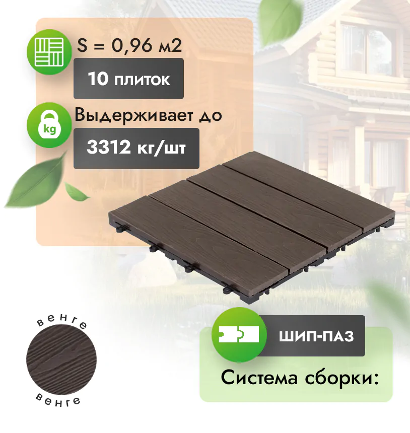 Наш садовый паркет из ДПК выдерживает до 3318 кг/м2, влагостойкий, не требует ухода.