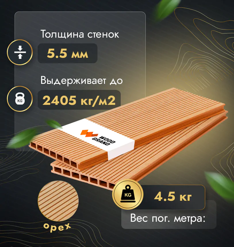 Наша террасная доска из МПК выдерживает до 3318 кг/м2, влагостойкая, не требует ухода.
